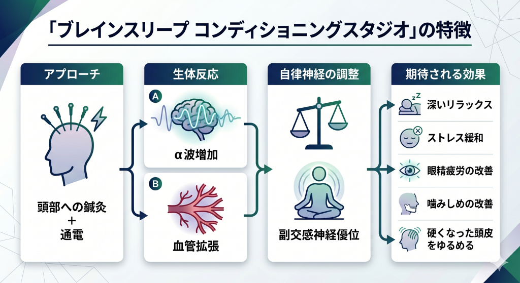 その理由はα波を出やすくし、副交感神経を優位にしやすくするためとのことでした。公式でも、鍼通電により血管拡張・α波増加を促し、副交感神経の働きを高めると説明されています。