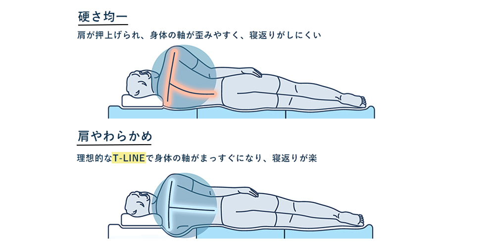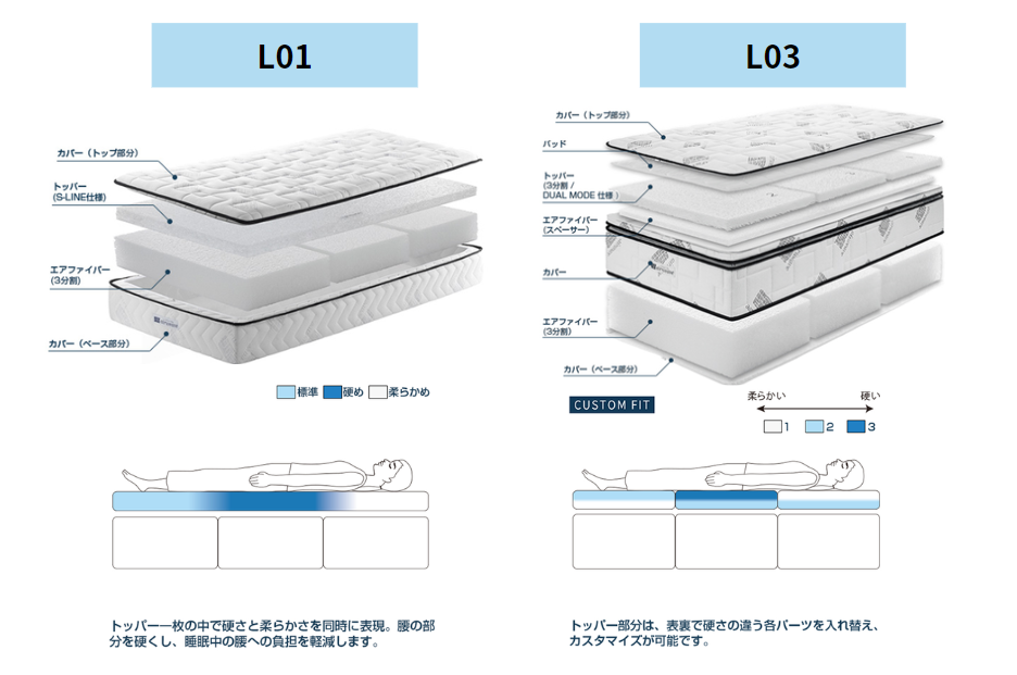 L01は、トッパー部分に肩を柔らかめ、腰を硬めに設定した設計で、腰の沈み込みを軽減し、快適な寝返りをサポートします。L03は、L01の機能性に加え、トッパー部分が3分割されており、肩・腰・脚の硬さを個々の体形や体格に合わせてカスタマイズ可能です。