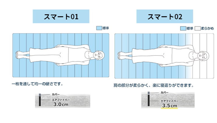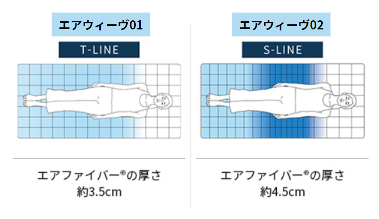 エアウィーヴ 02は、さらに腰のサポートを強化した機能性モデルで、エアファイバー®の厚さが増して安定感がUPしていること、肩・腰・脚と3段階の硬さ調整がされていることです。