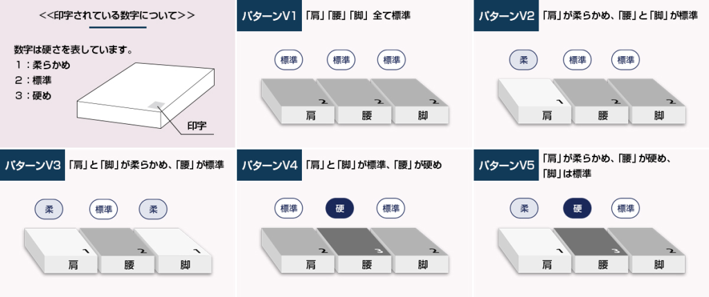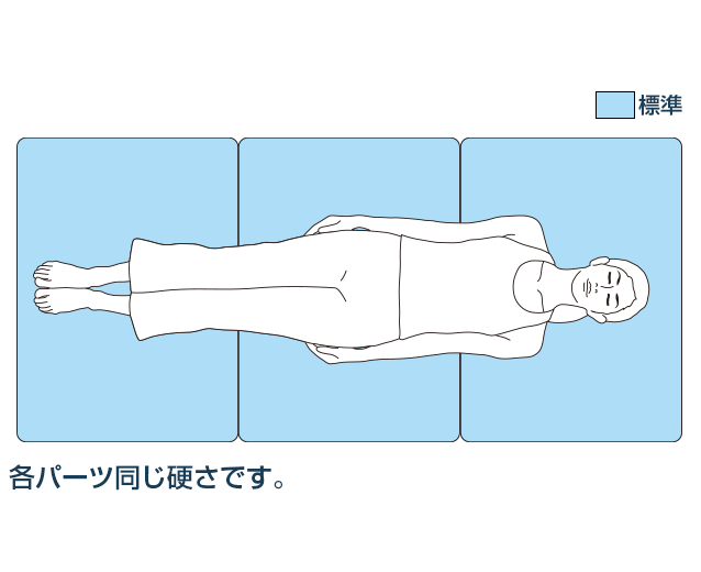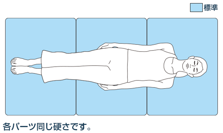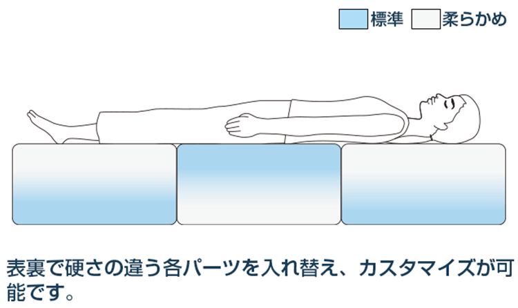 例えば、がっしりとした体型の方や、腰に負荷がかかりやすい方には、腰部分のみ硬いマットレスを提案するなど、エアウィーヴは体の部位ごとに硬さを変える「分割サポート」が特徴です。肩・腰・脚の各部位に異なる硬さを設定し、睡眠中の姿勢を最適にサポートするための工夫です。