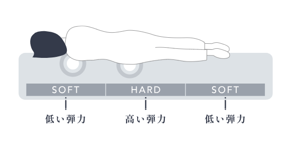 NELLマットレスと同様に腰部分を硬めにした「ゾーニング構造」もあり、スムーズな寝返りもサポートします。