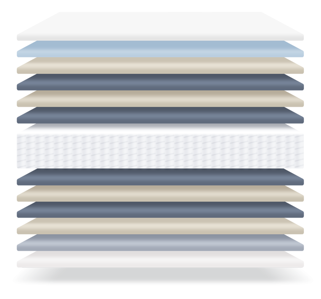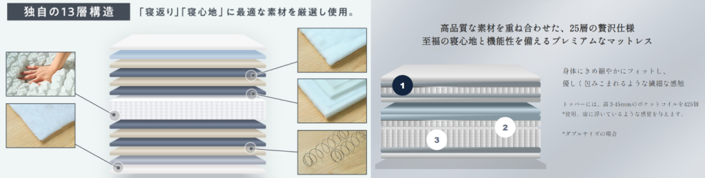 頭、腰、足に合わせて最適な硬さのポケットコイルを選び抜き、13層の素材を組み合わせた贅沢な構造。各層が寝心地を最大限に高め、体圧分散とサポートを両立。