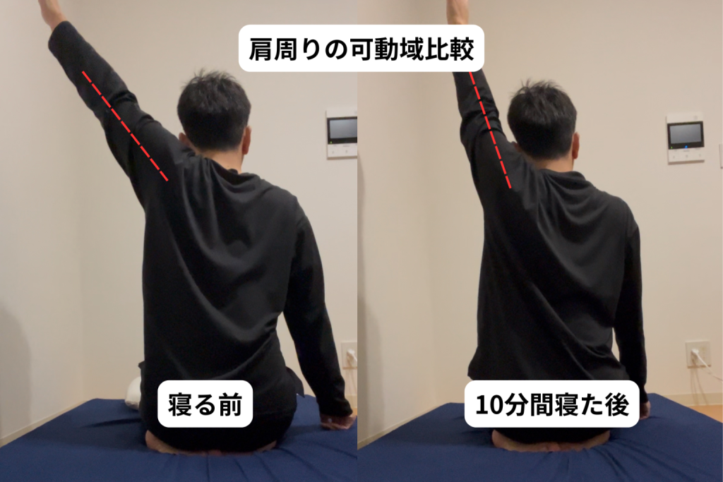 写真の通り、10分間横になるだけで肩回りの可動域が改善しました。血の巡りが良くなり、全身がじんわり温まる感覚があります。