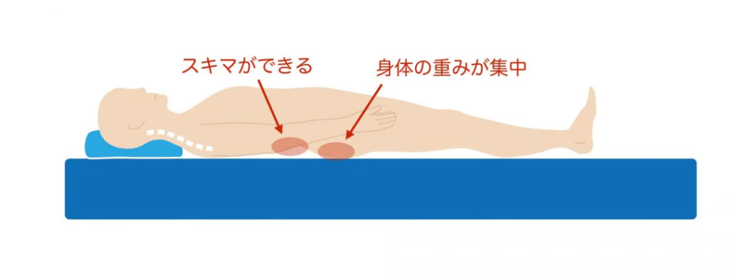 一般的なフラットなマットレスは、接触面が広いため体圧が集中しやすく、腰や肩に負担がかかることがあります。一方、エアーマットレスは独自の凹凸構造で体を「点」で支えます。