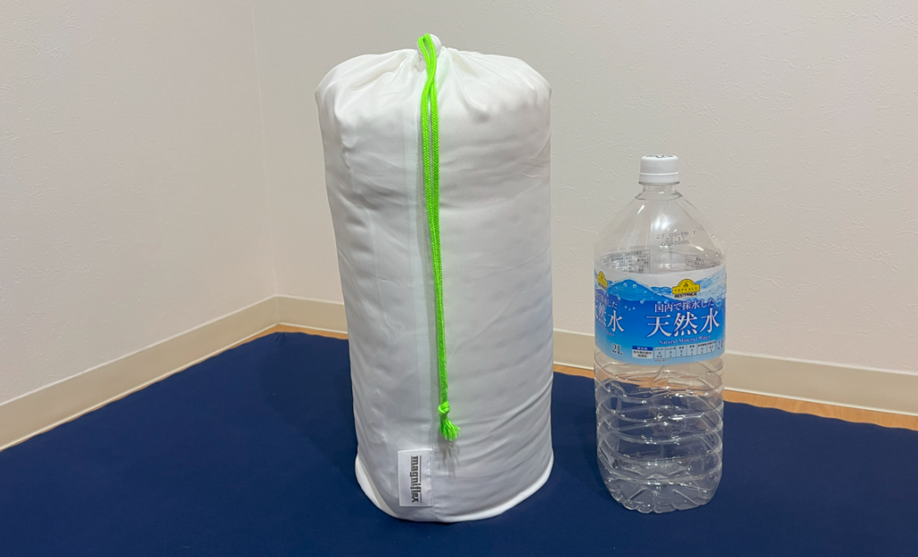 実際にキャリーホルダーに入れてみると、枕の大きさからは想像できないほどスムーズに丸めることができ、バッグにも収納可能なサイズに。