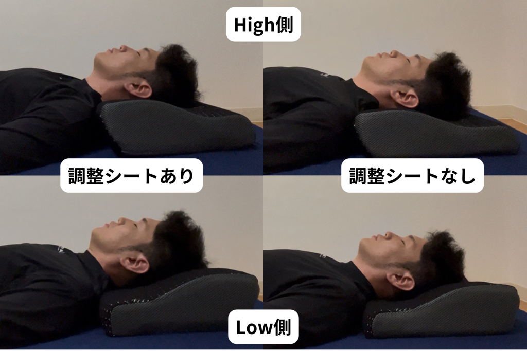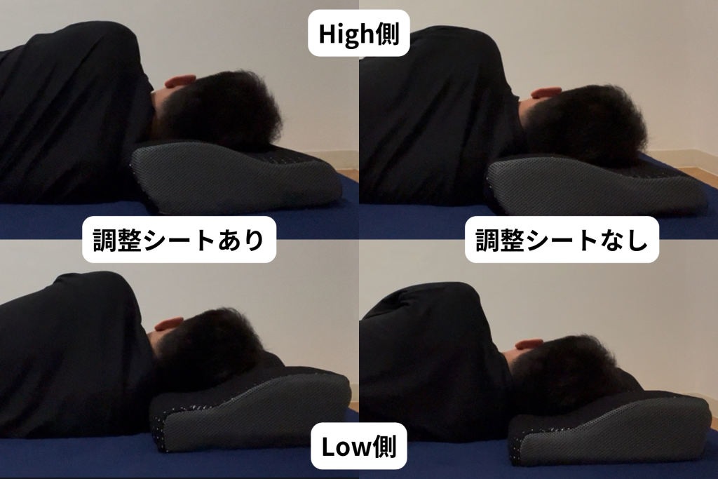 GOKUMINプレミアム低反発枕は、高さ調整シートの抜き差し+前後の向き変更で、計4通りの使い方が可能。自分に合った高さ・角度に細かく調整できるのが特長です。私は「調整シートなし、High側」が一番身体が一直線になる感覚があり寝心地が良かったです。