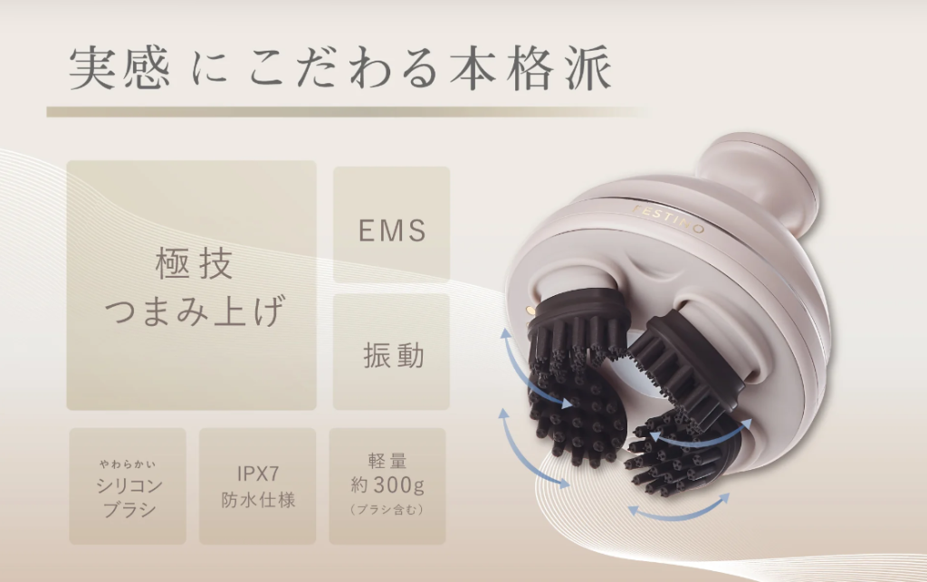 このEMSヘッドスパ プレミアは、まるでスパニストの手技のような“つまみ上げ”動作と、EMS・振動・2種のブラシで頭皮から全身まで本格ケアを叶える実力派アイテムです。