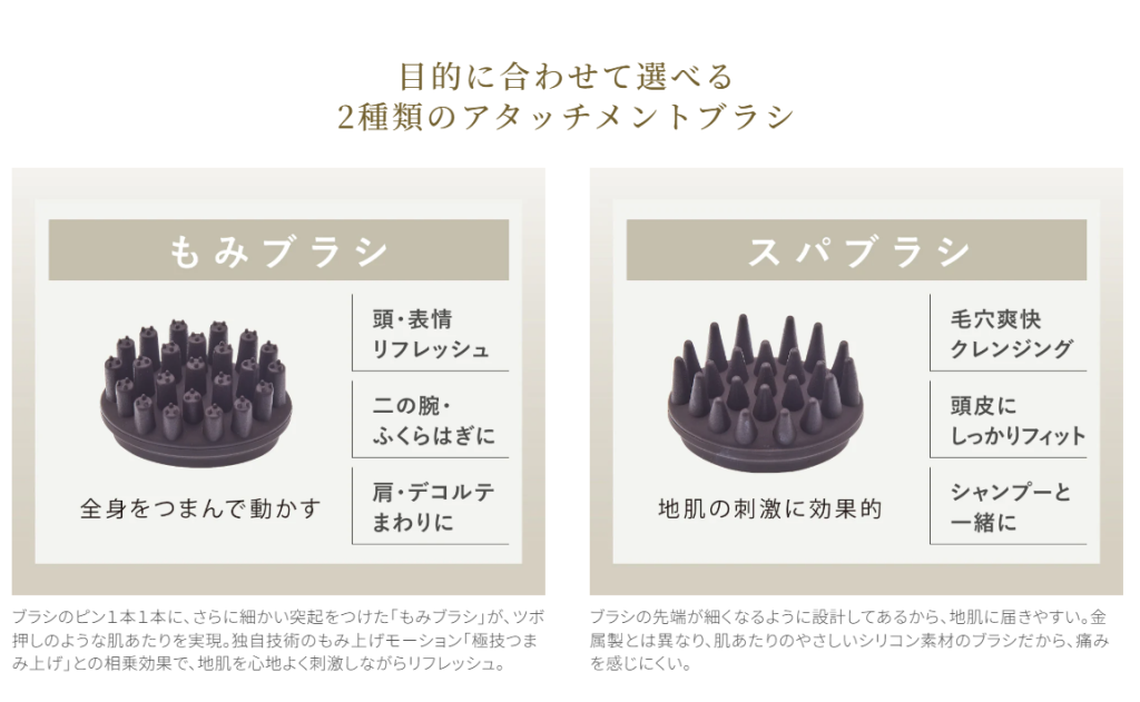 | 特徴 | 揉む・つまむ・引っ張る・押す・開く・閉める、6つのテクニックを再現 | もみ出し&ニードルアタッチメントで頭皮から顔・肩までスッキリケア | 2種のブラシと2つのモードで、頭皮から二の腕まで自分好みに全身ケア | 6種類のもみ心地を再現する、4種の独立ヘッド&回転モードでプロ級の揉み上げケアを実現 | 3段階EMSレベル×3種回転スピードの本格EMSケア。Amazonベストセラー。 |