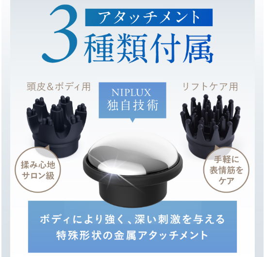頭皮専用のニードルアタッチメントをはじめ、部位ごとのアタッチメントで「揉む・つまむ・引き上げる」を再現。硬くなった頭皮や筋肉に深く届き、まるでヘッドスパ専門店に通ったような爽快感が得られます。