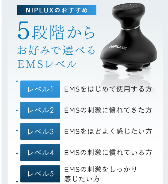 美容器具EMSはいくつか持ってますがレベル1〜5の中で1で充分満足です。頭に関してはものすごく骨に響くので痛い、マッサージとバイブだけで気持ちが良いです!効果が出てるかわかりませんがお風呂タイムが楽しいです。