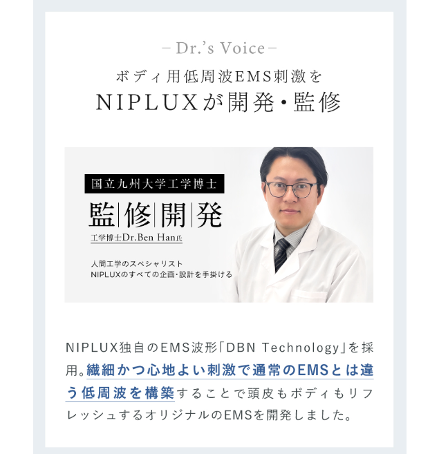 九州大学工学博士監修のもと開発された低周波EMS「DBN Technology」で、心地よく深層筋までアプローチ。満足度98%、シリーズ累計200万台超の信頼のヘッドスパです。