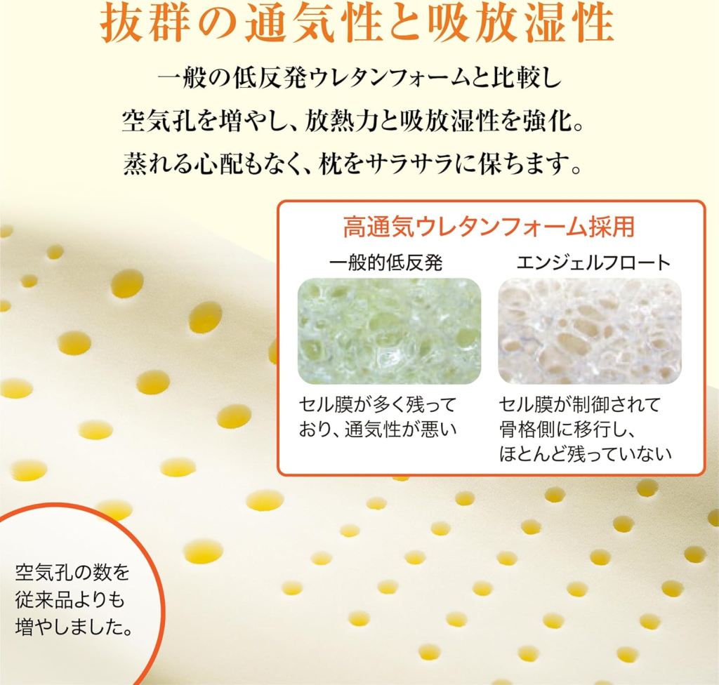 エンジェルフロートには空気孔を多く備えた高通気ウレタンフォームを採用。これにより熱がこもりにくく、夏場でも快適に使用できます。さらに、この特殊ウレタンは気温によって硬さが変わりにくいため、冬でも硬くなりにくく、一年を通して同じ寝心地をキープできます。