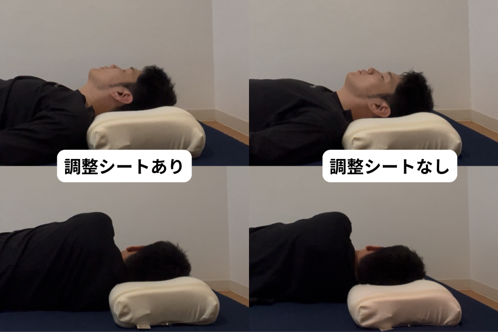 実際に寝てみると、仰向け・横向きのどちらの寝姿勢でも首と頭の角度を自然に保つことができます。調整シートを入れたやや高めの高さ(10cm)でも、枕が柔らかく苦しさは感じません。