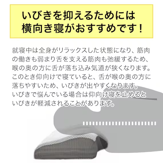 横向きの寝姿勢は気道を確保しやすく、いびきの軽減にもつながると言われており、いびき対策や首・肩の負担軽減を求める方から高い支持を得ています。