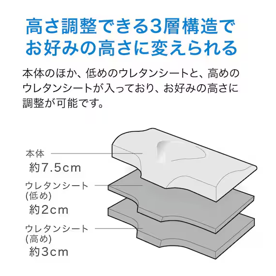 本体に加え、厚みの異なる2種類のウレタンシートを組み合わせることで高さを4段階に調整可能。約7.5〜12.5cmまで好みに合わせて変えられるため、体格や寝姿勢に合わせて“自分専用のフィット感”をつくれます。