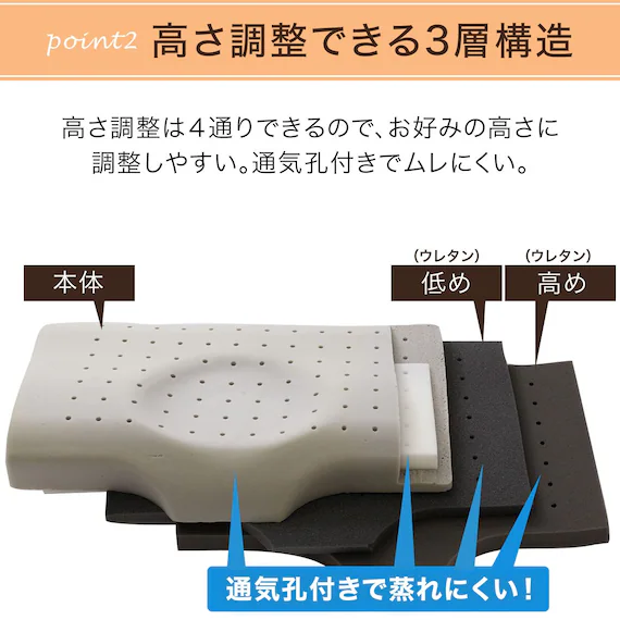 内部に多数の通気孔を配置し、従来品に比べて格段に通気性がアップ。湿気や熱がこもりにくく、汗をかきやすい夏場や湿度の高い季節でも快適さが長続きします。蒸れに悩んで枕を変えてきた方にも安心です。