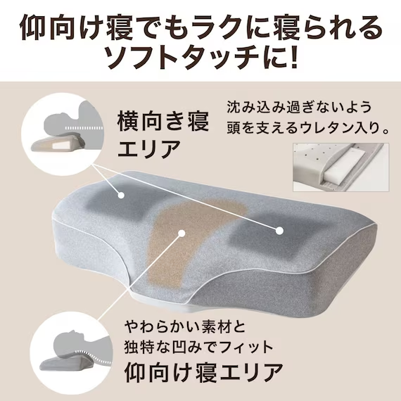 横向き寝だけでなく仰向け寝でも快適に使えるよう、低反発ウレタンやソフトタッチ素材を採用。さらに高さ調整や通気性、カバーの利便性などがアップデートされ、幅広い寝姿勢や好みに対応できる仕様となっています。