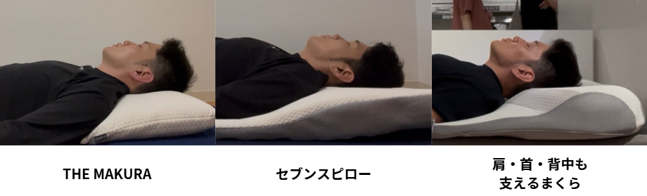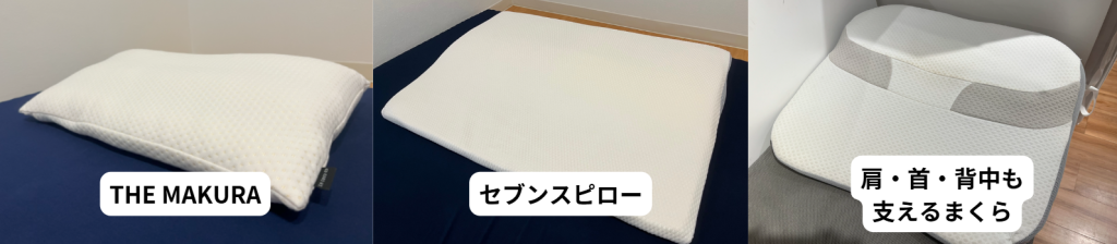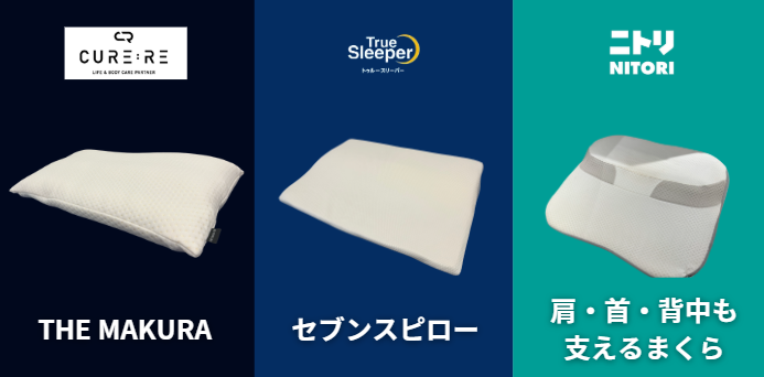 整体理論をベースにした キュアレ「THE MAKURA」、大型低反発まくらとして知られる トゥルースリーパー「セブンスピロー」、そしてコストパフォーマンスに優れた ニトリ「肩・首・背中も支えるまくら」です。