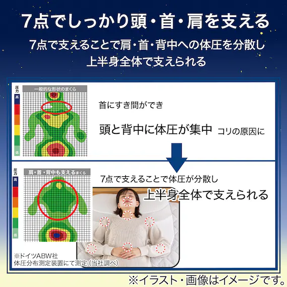 頭から首、肩、背中、腕まで合計7部位を包み込むように支える「ボディフィットカーブ」が最大の特徴で、寝ているときに生じやすい細かな隙間を埋めて体圧を分散。仰向けでも横向きでも自然な寝姿勢を保ちやすく、首や肩の負担を和らげてくれます。
