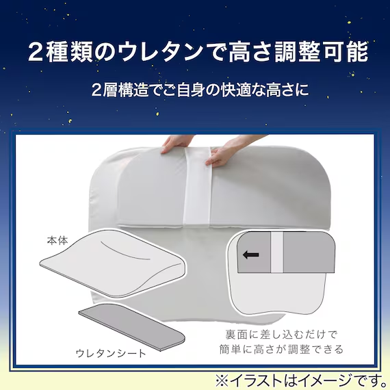 特徴整体理論をもとに開発された独自の三段構造を採用体温と体圧に反応して沈む低反発素材で頭・首・肩・背中・腕まで7部位を支える頭部のウレタンがU字型に設計されており、首元をしっかり支えつつ横向き寝の姿勢もサポート