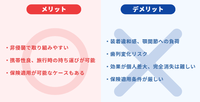 | 口腔内装置 (マウスピース) | 軽〜中等度に有効 | ○ (睡眠時無呼吸症候群診断時) | 約1〜2万円 | 非侵襲的で続けやすい |