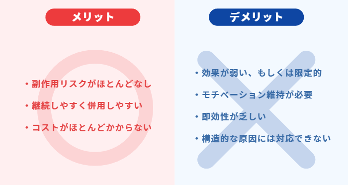 | 生活習慣改善 | 軽症に有効 | × | 自費 | 副作用が少なく、安全に取り組める |