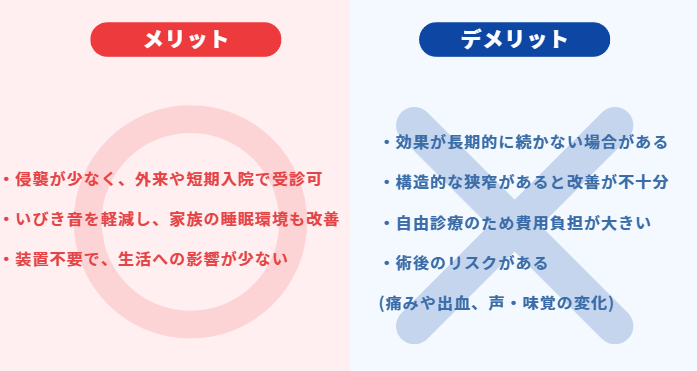 ・日本では、主に「いびき(単独症状)」を対象としたLAUPは、原則として保険適用外(自由診療)とされているケースが多いです。