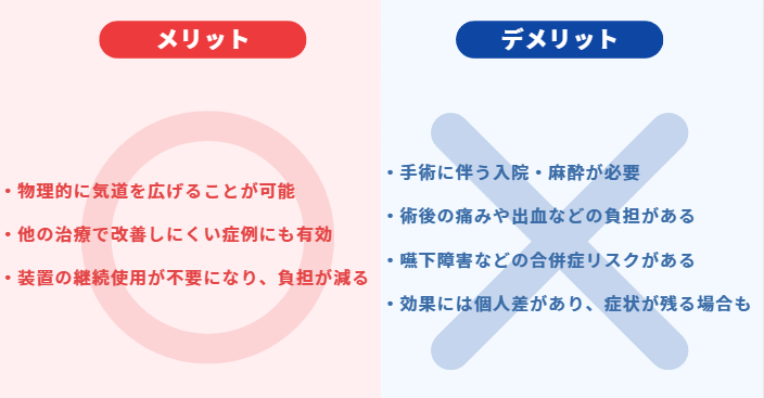 ・特に、保存的治療・装置療法で十分な改善が得られない、あるいは明らかな咽頭部構造異常(扁桃肥大・口蓋垂長・軟口蓋振動部位など)がある場合に検討されることが多いです。