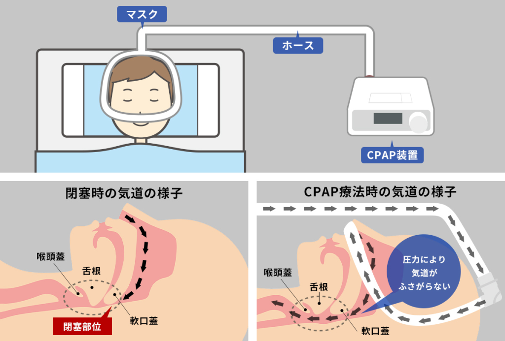 CPAP(Continuous Positive Airway Pressure:持続陽圧呼吸療法)は、マスクとチューブを通じてあらかじめ設定した空気圧を気道に送り、睡眠中の気道を「押し広げ続ける」ことで、無呼吸や低呼吸、いびきを防ぐ治療法です。
