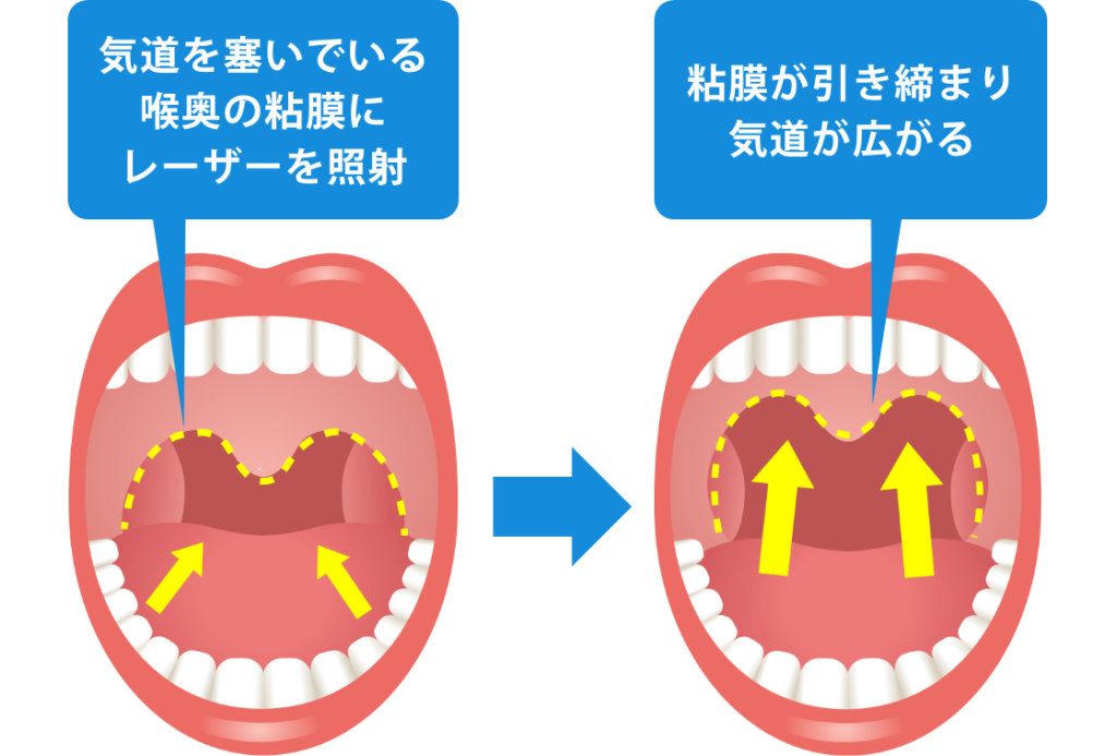 軟口蓋や口蓋垂(いわゆる「のどちんこ」周辺)をレーザー照射で縮小・硬化させ、振動しやすい軟組織を変性させることで、いびき発生部位の振動源を減らす手法です。レーザーを用いることで、比較的少ない侵襲で手術可能なケースもあります。