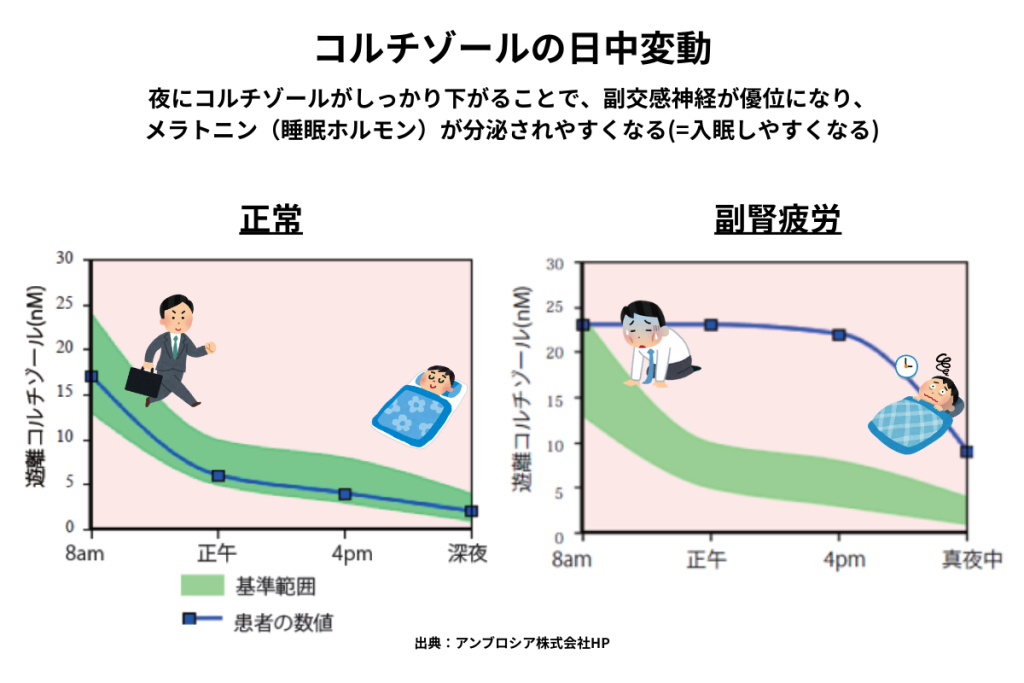 副腎から分泌される「コルチゾール」というホルモンは、体内のリズムを整える役割を持ち、朝に高く、夜に低くなるのが正常です。