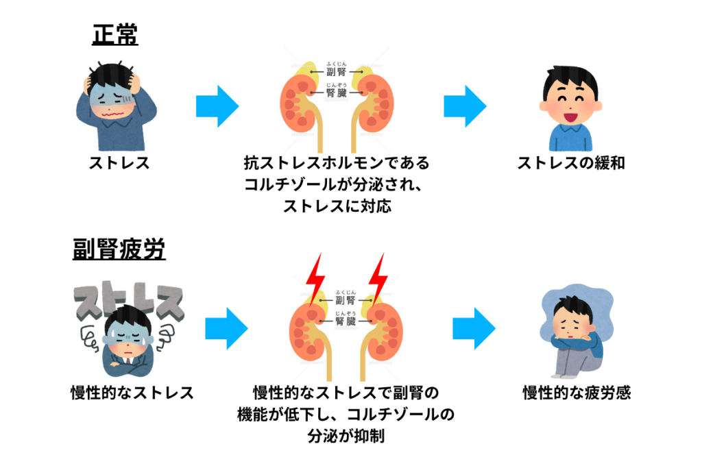副腎疲労とは、長期のストレスや生活習慣の乱れによって、副腎(腎臓の上にある小さな臓器)が疲弊し、必要なホルモンの分泌が低下する状態です。